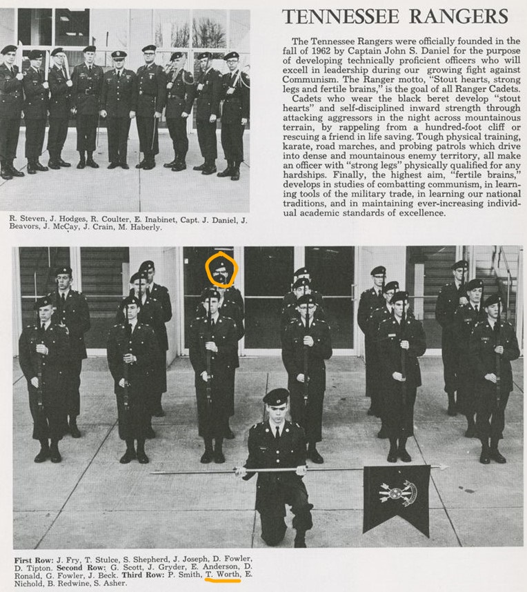 Timothy Lane Worth (March 15, 1944 – Jan. 31, 1968) was from Tullahoma Tennessee. He attended the University of Tennessee and was an active member of UT’s ROTC Cadet program from 1962 to 1966. During the Vietnam War, Worth volunteered to enlist in the United States Army. He was assigned as a 2nd Lieutenant working in military intelligence with the 45th Military Intelligence Company of the 519th Battalion in the 525th Group USARV. He began his tour on June 26, 1967, but was reported missing was reported missing while conducting operations in South Vietnam, Gia Dinh province in January 1968. He was found and declared killed in action on January 31, 1968 during the start of the Tet Offensive. Worth was posthumously granted the rank of 1st Lieutenant for his valorous service and is honored on the Vietnam Veteran’s Memorial in Washington DC. Name inscribed at VVM Wall, Panel 36e, Line 44. He is buried at Acacia Park Cemetery in Birmingham, Michigan.